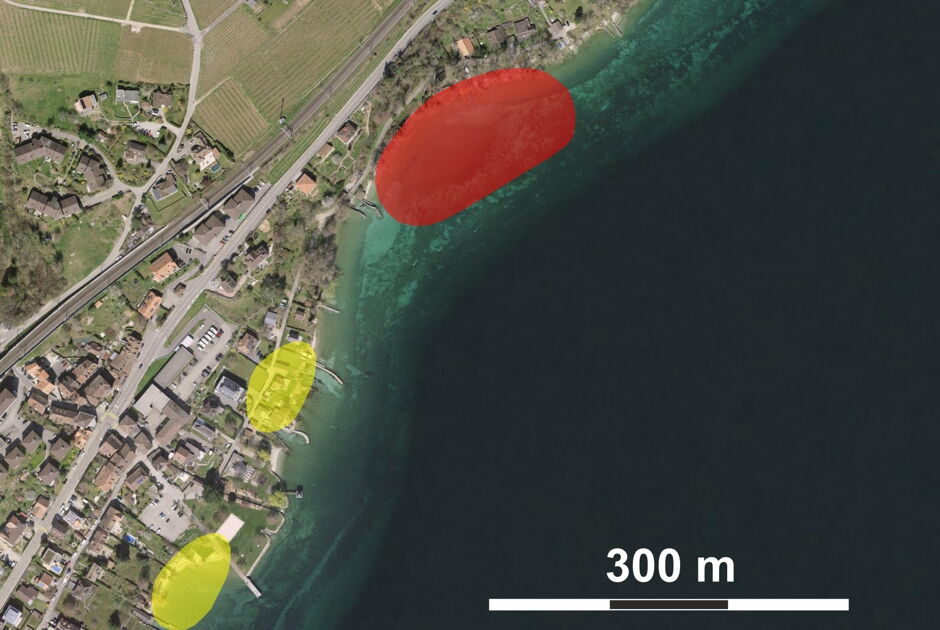 Diese weitläufige Seeufersiedlung, die in einer kleinen Bucht erhalten geblieben ist, wurde nicht ausgegraben. Das Pfahlfeld mit fast 5000 Pfählen ist vollständig unter Wasser und reicht bis zum heutigen Ufer. Es wurde erstmals 1909 erwähnt. Abgesehen von den Pfählen, die aus dem Seeboden herausragen, ist die Fundstelle durch einen Kieshügel (Tenevière) gekennzeichnet, der zahlreiche archäologische Objekte enthält, darunter polierte Steinäxte, Werkzeugschäfte aus Hirschgeweih, Fragmente grober Keramik usw. Die dendrochronologische Datierung von acht Holzproben scheint auf zwei aufeinanderfolgende Besiedlungen in der mittleren Jungsteinzeit hinzudeuten, die erste in der klassischen Cortaillod-Kultur zwischen 3841 und 3817 v. Chr., die zweite in der späten Cortaillod-Kultur zwischen 3531 und 3528 v. Chr. Im Jahr 2015 ergab eine systematische topografische Vermessung der an der Oberfläche sichtbaren Pfähle, dass die Ausdehnung der Fundstelle viel grösser ist als zuvor angenommen. So wurden 4834 Pfähle auf einer Fläche von 7000 m² gezählt. Der unterschiedliche Erhaltungszustand der Pfähle lässt auf eine Besiedlung im klassischen Cortaillod im Osten und im späten Cortaillod im Westen schliessen, da diese besser vor Erosion geschützt waren.
